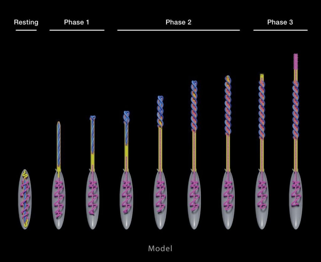 During phase 1, the shaft is ejected from the capsule as a dense missile-like structure in a highly coiled configuration. The shaft is propelled forward until the shaft-capsule connector is stretched to its maximum length. This marks the beginning of phase 2 when the three filaments of the shaft start to uncoil and turn inside out at the top of the shaft, allowing the bottom of the shaft to move forward within the uncoiling filaments. The tubule that is connected to the base of the shaft is also pulled forward within the cavity created by eversion of the shaft.