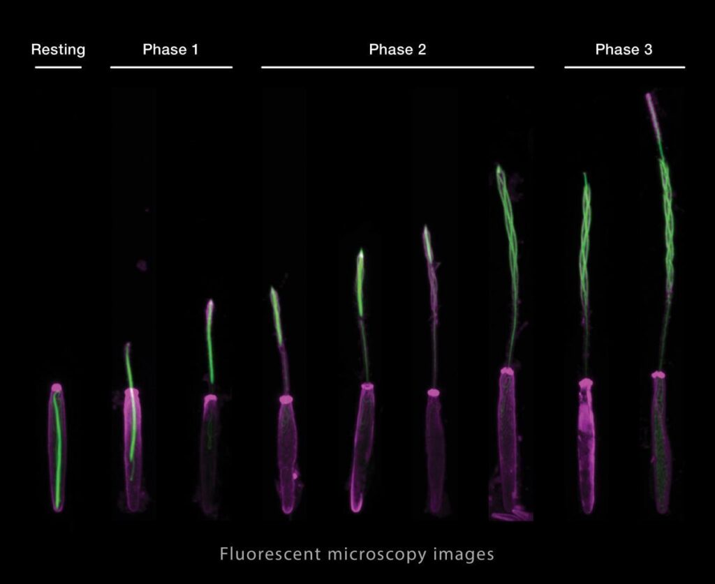 When a nematocyst discharges, the stinging thread emerges from the capsule and is propelled forward and elongated by a mechanism called eversion, where the thread substructures turn inside out. Recording the fluorescent discharge events at high speeds, Karabulut was able to define that nematocyst firing occurred in three unique phases. Phase 1, 2 and 3 are characterized as shaft discharge, shaft eversion, and tubule eversion, respectively.