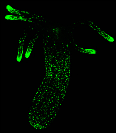 Fluorescent expression of nematocytes, the specialized cell that creates nematocysts. Notice that nematocyte concentration is highly expressed in the tentacle tips.