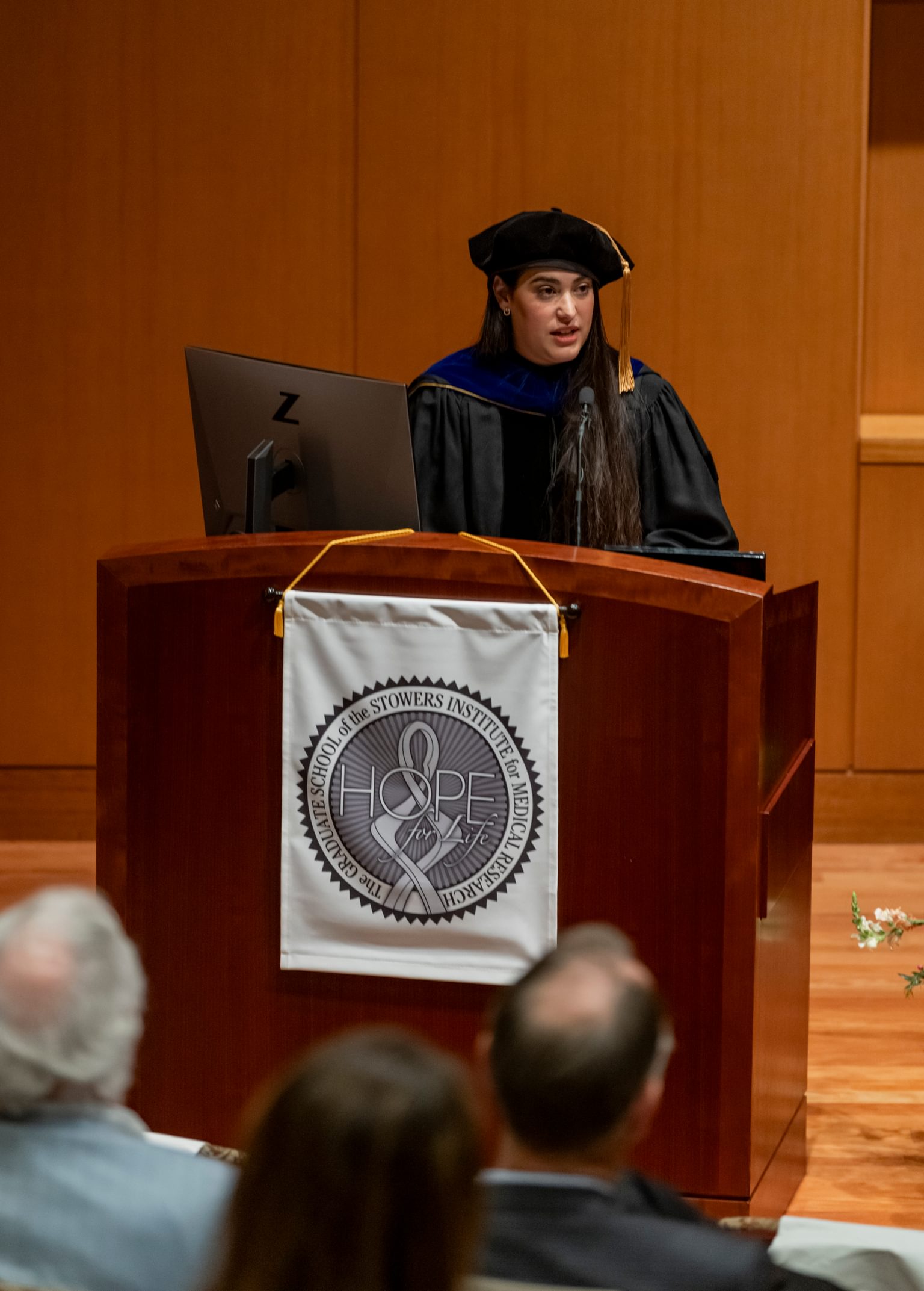 The ceremony was attended by Graduate School faculty and board members, Institute staff, Stowers family members, current predoctoral researchers, and the graduates’ families and friends—all gathered in person and virtually to recognize and celebrate the accomplishments of the 2025 class.