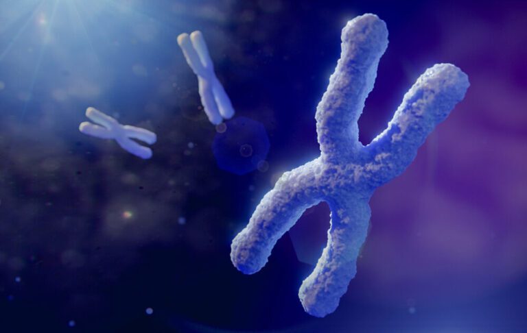 Cells of the human body contain DNA distributed into 23 pairs of linear strands called chromosomes, one set inherited from each parent. These 46 discrete DNA strands located in the cell’s nucleus are combined with proteins to make chromosomes, units of information that are replicated during cell division. Although typically pictured as a bubble letter ‘X’, this representation is of chromosomes that have replicated and packaged themselves into highly condensed DNA-protein parcels just before a cell divides. Each chromosome contains specific sequences, including genes, and are part of what makes us unique.