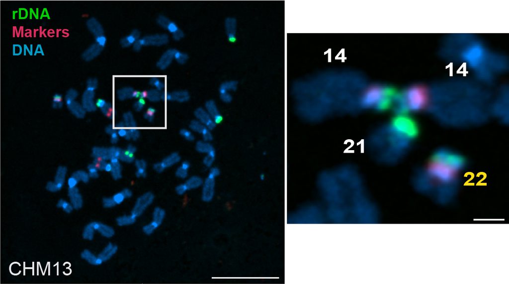 Fluorescent microscopy image of the chromosome spread from the CHM13 cell like showing rDNA linkages between acrocentric chromosomes (left). Magnification show linkage between two copies of chromosome 14 with a copy of chromosome 21 (right).