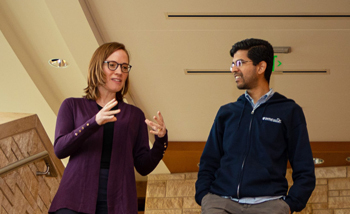 Julia Zeitlinger and Anshul Kundaje discuss details of the BPNet model during Kundaje’s visit to Stowers.