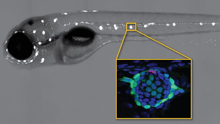 Scientists from the lab of Stowers Institute Investigator Tatjana Piotrowski, Ph.D., have found an important gene in zebrafish that acts like a switch, deciding whether a developing hair cell will become one that senses water motion or one that helps with hearing. Because this gene plays such a central role in determining a hair cellās identity, similar human genes could become powerful targets for therapies aimed at reprogramming damaged human hair cells. This kind of approach may one day help restore hearing and balance ā problems that affect millions of people worldwide.