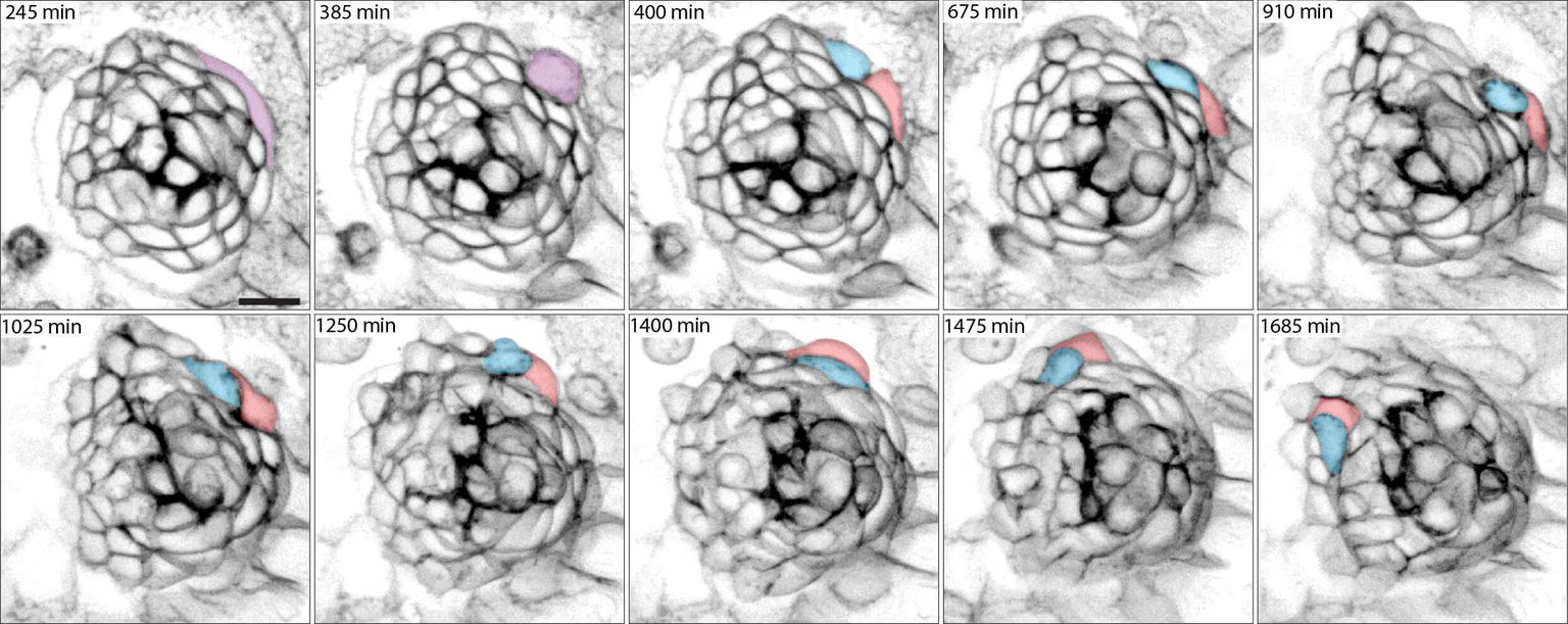 Time-lapse image of activated precursor neuromast ionocyte (purple) that then divides into two ionocyte cells (blue and red). These two cells invade the neuromast and help control the flow of ions.