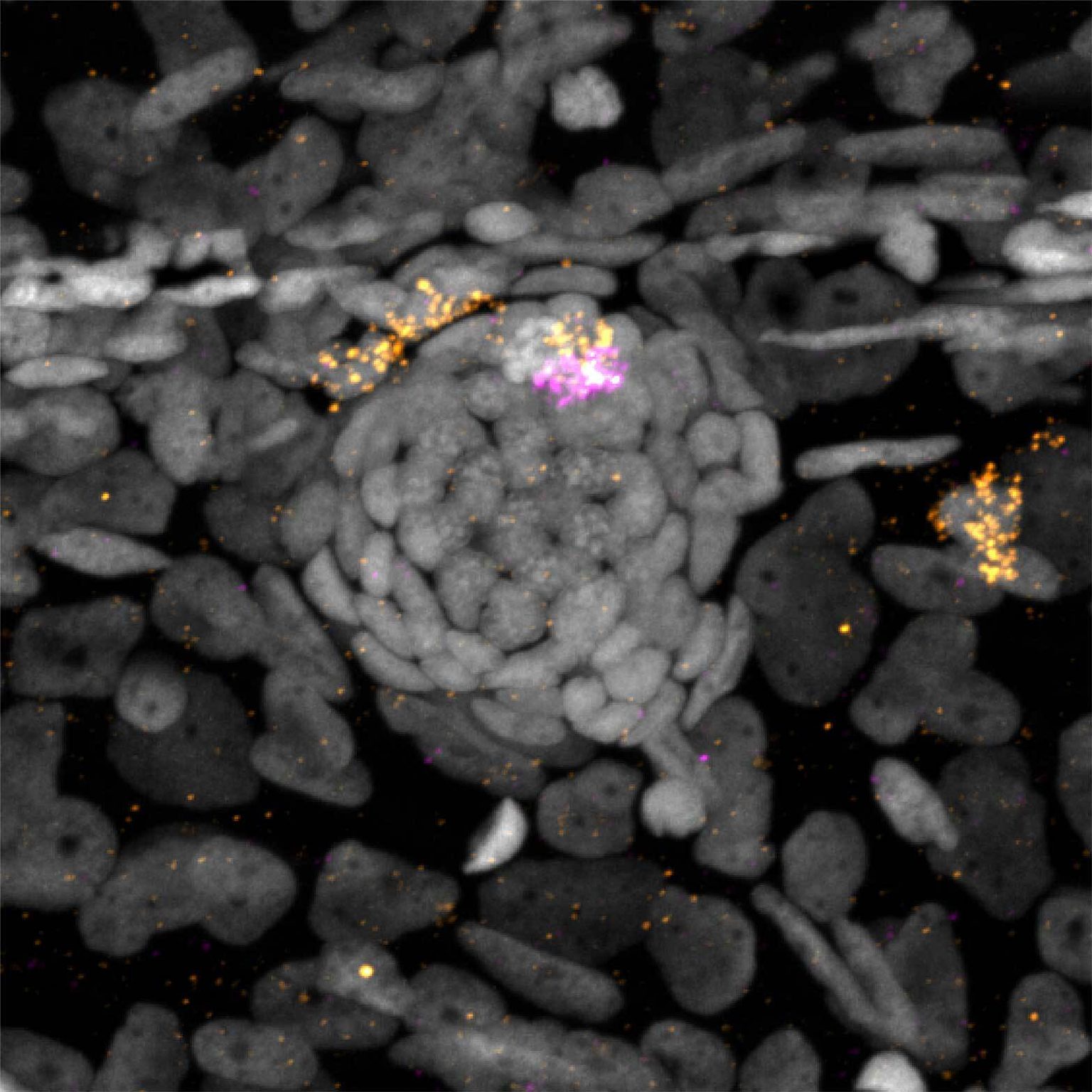 Confocal microscopy image showing a neuromast where different colors label different genes in neuromast ionocytes. Precursor neuromast ionocytes are orange and a mature ionocyte pair in orange and pink.