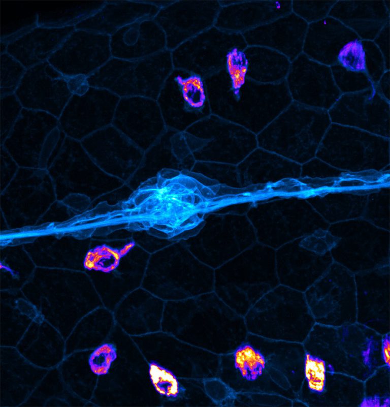 Confocal microscopy image showing skin ionocytes in red/orange and a neuromast in cyan.