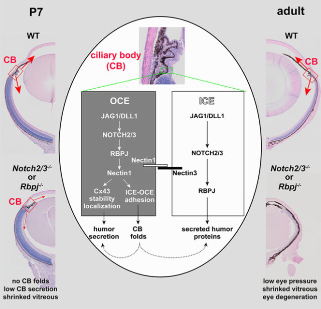 When the Notch signaling pathway—an important cell signaling system found across the animal kingdom—is defective in the ciliary bodies of newly born mice, they fail to develop folds, and secretions decrease, leading to shrunken vitreous bodies. In adult mice, defects in Notch signaling cause low eye pressure, a shrunken vitreous, and eye degeneration. Inactivation of the downstream transcription factor RBPJ in the ciliary body also leads to the same effects. Before now, the underlying molecular mechanism for this outcome was unclear.