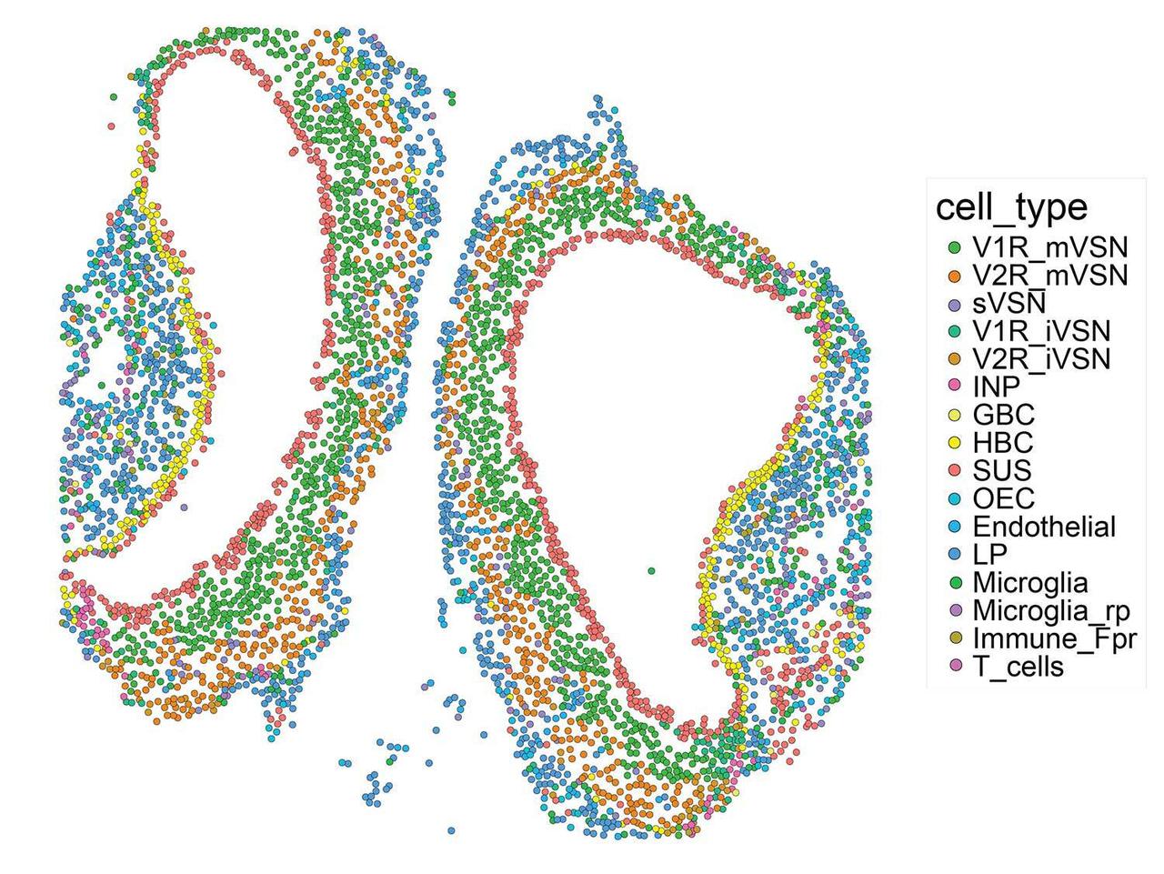 Spatial location of individual mouse vomeronasal organ cells color-coded by cell type.