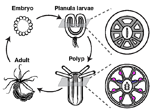 Schematic illustration of the sea anemone, Nematostella vectensis, life cycle. Retractor muscle cell types (magenta) are patterned within segments.