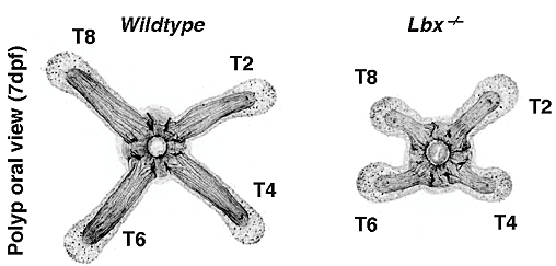 Comparison of morphological difference between a normal seven-day-old sea anemone (left) and a sea anemone lacking a required segment polarity gene (right).