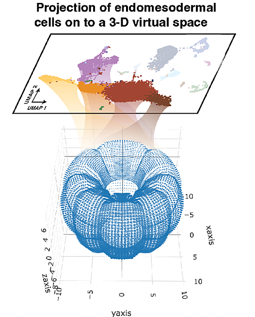 3D expression atlas of developing sea anemone. Single cell RNA sequencing data from 72-hour-old sea anemone cells are projected onto a 3D virtual space.