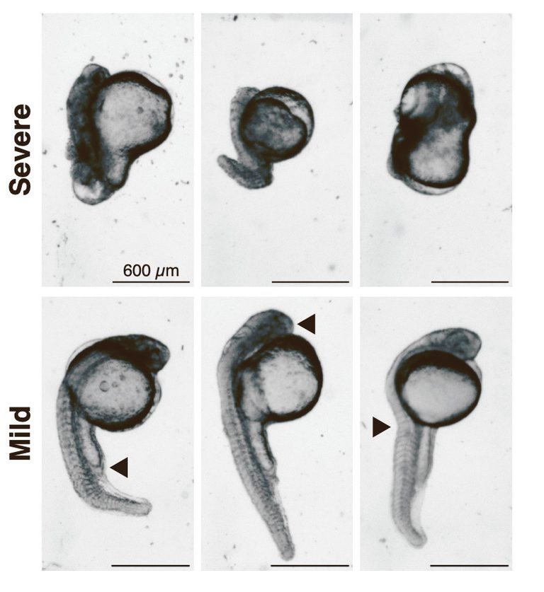 Microscopy images of severe and mild abnormalities observed in zebrafish embryos after CRISPR-Cas13d silencing of a critical developmental gene. Arrows point to tail shortening, deformation, or smaller head size.