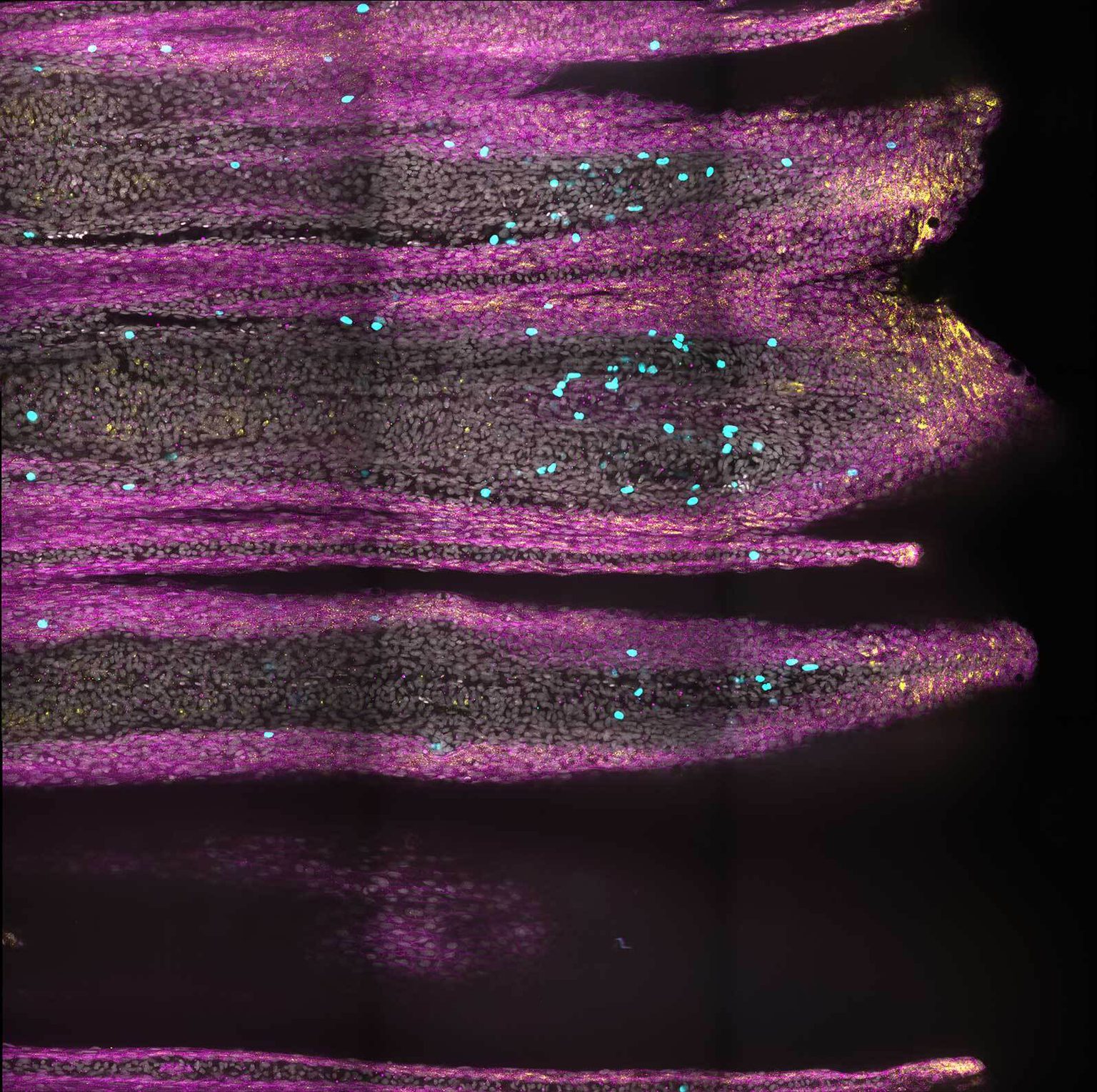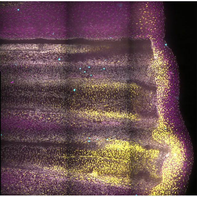 Tail fin regeneration at 7 days post-injury. Fluorescence microscopy image shows skin cells (magenta), actively dividing cells (cyan), and transiently activated skin cell states (yellow), where these cell states are localized now only in the very tip of the fin.