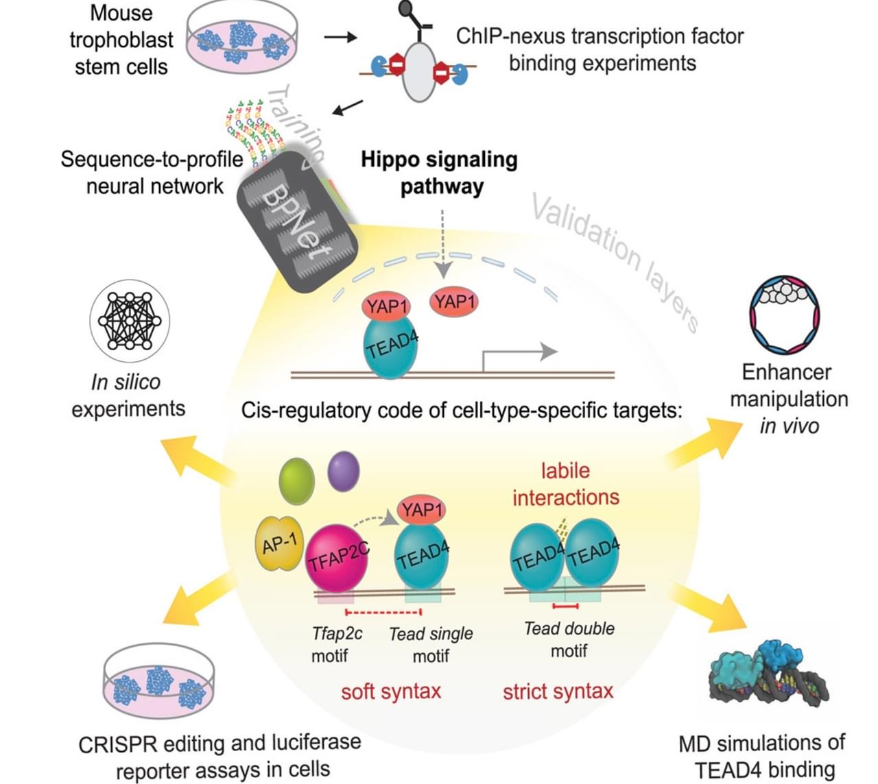 The team investigated how two transcription factors that belong to the Hippo signaling pathway, YAP1 and TEAD4, bind DNA together with transcription factors unique to mouse trophoblast stem cells to control which genes are turned on. The researchers utilized the AI tool BPNet, an interpretable deep learning framework that can both make predictions and can also explain how those predictions were made, to learn genome-wide relationships between DNA sequence patterns and transcription factor binding profiles.