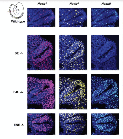 Additionally, while the three enhancers were known to be required for Hoxb gene transcription, how each one contributes was addressed by making function-disrupting mutations for each, and then examining mouse lines harboring one, two, or all three mutations.