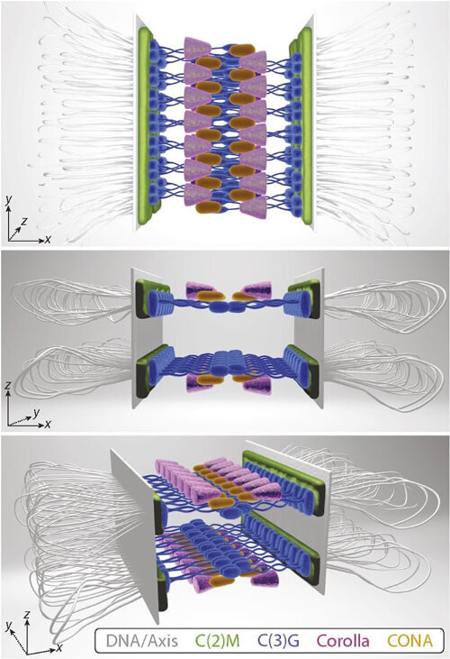 Super-resolution expansion microscopy reveals the structural organization of the fruit fly synaptonemal complex. This 3D model constructed from microscopy data shows two mirrored layers of the synaptonemal complex which is important for meiosis, the cell division that generates eggs and sperm.