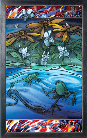 “I decided to incorporate all of these animals into the piece and have them interact to make the piece come alive,” says Barnard. The resulting piece features some playful mice with wings, frogs, fish and a lamprey swimming in the pond, along with a few insects buzzing around the flowers of an echinacea plant. The borders are etched with patterns reminiscent of the nerves branching out of the brain region Krumlauf studies. At the top of the piece, a curious mouse peers into the scene below. “I included that element to bring you in,” says Barnard. “You are that mouse, observing it all.”