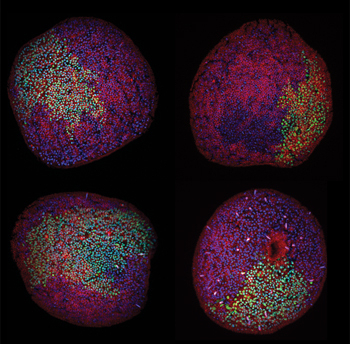 Stowers Predoc Peloggia de Castro made it into last year’s calendar with an image that features four bright red and blue balls of cells covered in smatterings of green, showing the starlet sea anemone at early stages of development. When she traveled home to São Paulo, she took a handful of copies of the calendar with her to share with her grandmas. The calendar not only gave them bragging rights but also served as a conversation piece for her to talk to people in her community about science.