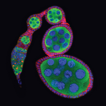Dani Wellemeyer, head of outreach and community engagement at the Miller Nichols Library at the University of Missouri-Kansas City (UMKC), recalls being captivated by the larger-than-life views of biology afforded by the traveling exhibit. Her favorite image depicted the ovaries of a fruit fly as a cobblestone path of green blobs, each outlined with red and blue hatch marks and filled with bubbles of blue material. Wellemeyer was not the only one picking favorites; people often asked her if they could buy copies of the images to take home with them.